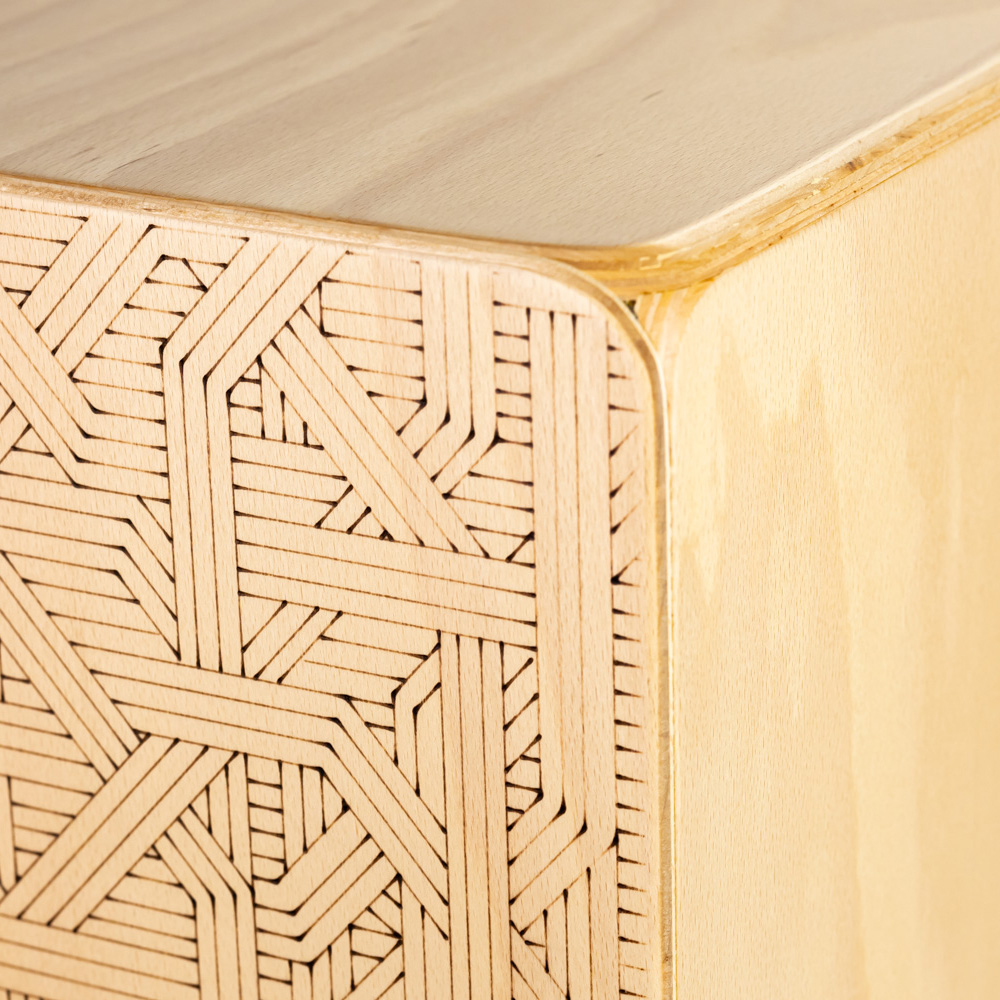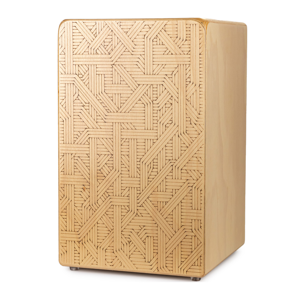 Кахон виготовлений з високоякісної букової фанери, яка забезпечує природний резонанс і довговічність інструмента. Поверхня покрита матовим акриловим лаком, що захищає дерево та надає приємну тактильну текстуру.