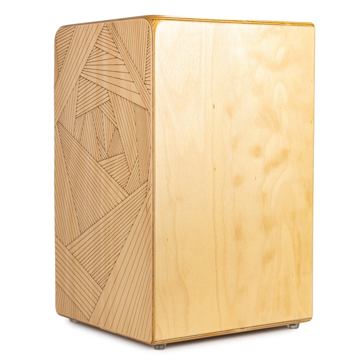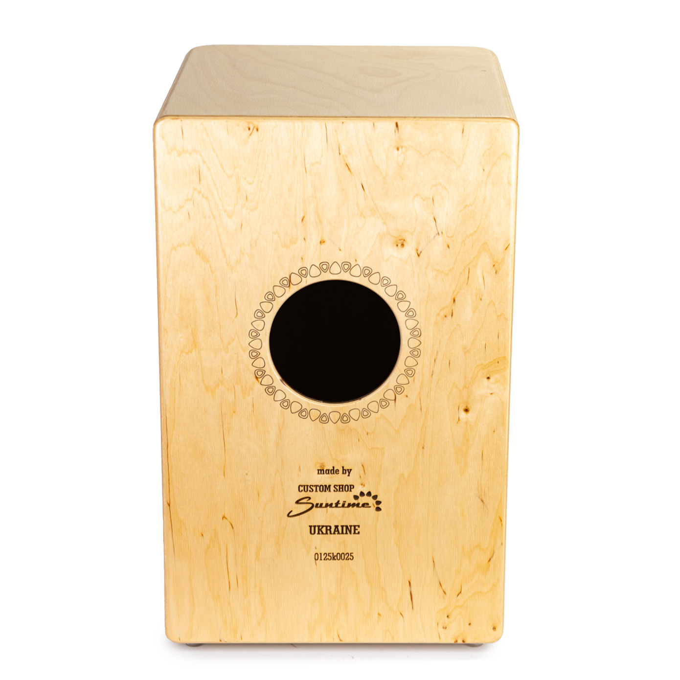 Кахон виготовлений з високоякісної букової фанери, яка забезпечує природний резонанс і довговічність інструмента. Поверхня покрита матовим акриловим лаком, що захищає дерево та надає приємну тактильну текстуру.